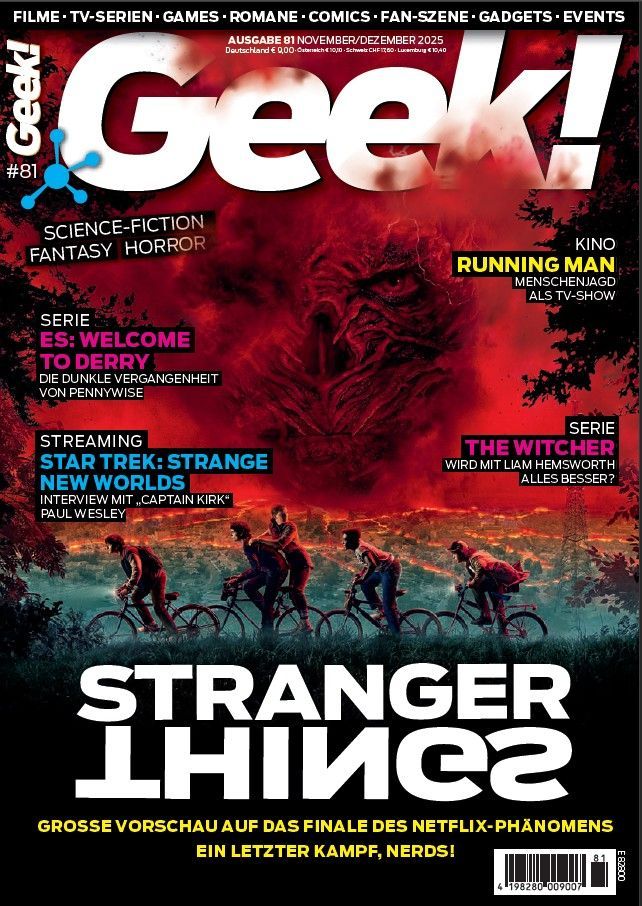 Heute ist die 81. Ausgabe der Geek! erschienen. Darin bringen wir eine große Vorschau auf die letzte Staffel von Stranger Things , sprechen mit "Captain Kirk" Paul Wesley aus Star Trek: Strange New Worlds , schauen mal, was uns in Running Man und The Witcher erwarten könnte, und stellen daneben natürlich jede Menge weitere Filme, Serien, Bücher, Comics und Games aller Art vor.