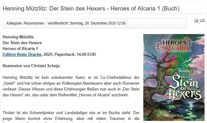 „Der Stein des Hexers“ ist eine leichtfüßige und unterhaltsame Fantasy-Geschichte, die das Rad nicht neu erfindet, aber sicherlich gerade die Leser zum Schmunzeln bringt, die selbst bereits in der Haut einer solchen Figur steckten und entsprechend Abenteuer erleben durften." Eine Rezension zu Heroes of Alcaria auf Phantastik-News von Christel Scheja , die ich gar nicht mitbekommen hatte. Schön, dass das Buch zu gefallen wusste und verstanden wurde, worum es mir ging! Hier geht es zur kompletten Rezension .