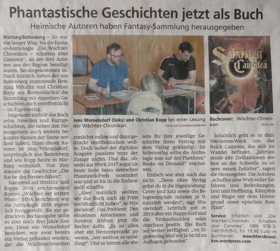 Vergangene Woche erschien auch in der Hessisch-Niedersächsischen Allgemeinen (HNA) der Artikel über den Werdegang unserer Anthologie Wächter-Chroniken - Schatten über Camotea, die im vergangenen Jahr erschienen ist. Jens Womelsdorf, der an der Anthologie mit einer Kurzgeschichte beteiligt ist, gab einen Überblick über die Schwierigkeiten der Veröffentlichung und den Inhalt unserer fast 500 Seiten starken Sammlung von Novellen, Kurzgeschichten und Hintergrundtexten innerhalb der Welt Camotea.